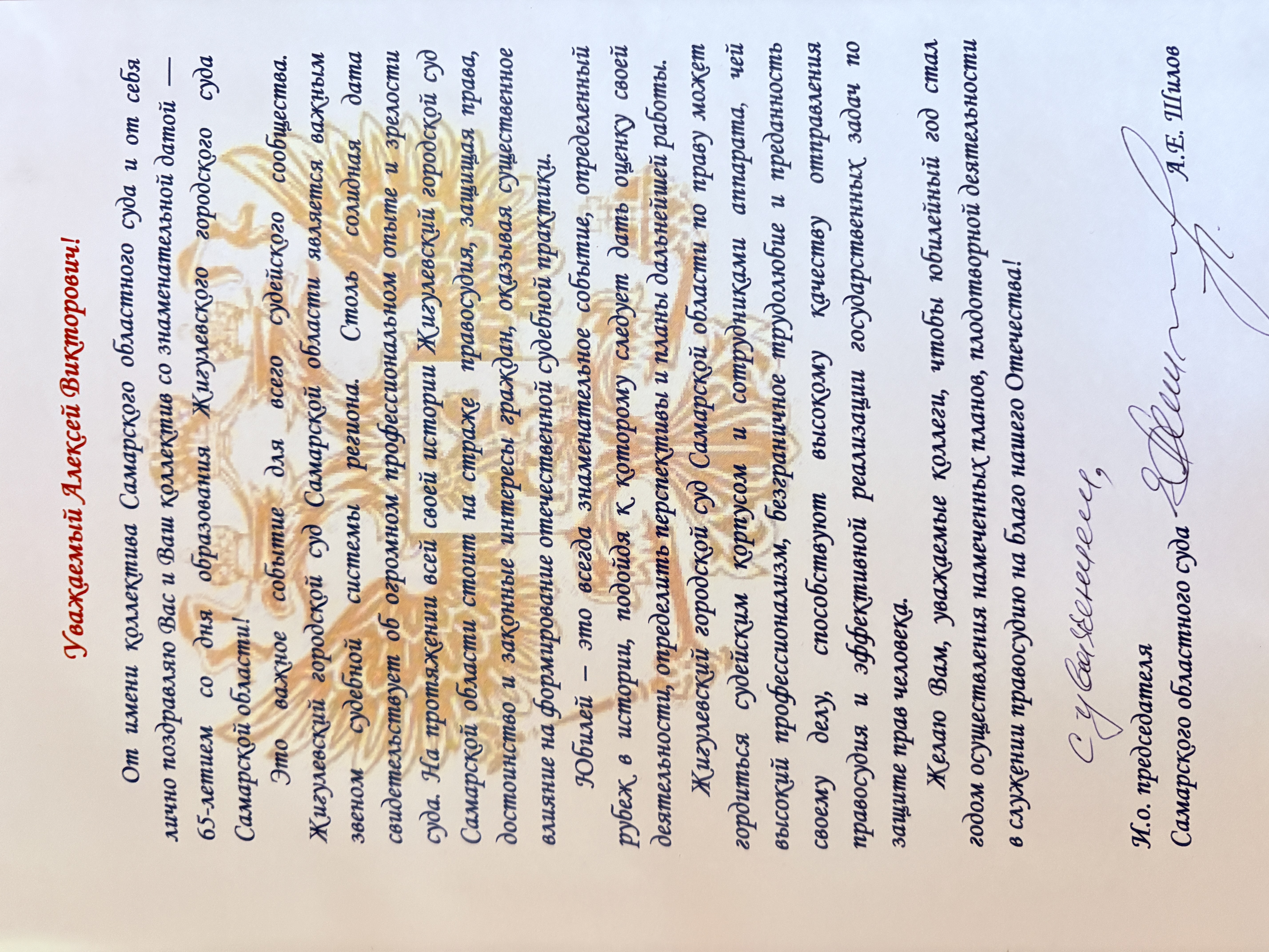 Поздравление руководства Самарского областного суда с 65-летием со дня образования Жигулевского городского суда Самарской области